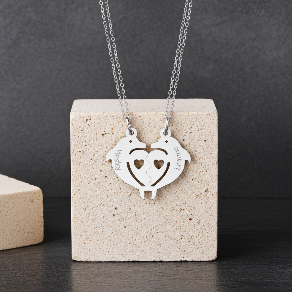 Zilveren graveerplaatje breekhanger Dolfijnen met hartje ketting hanger