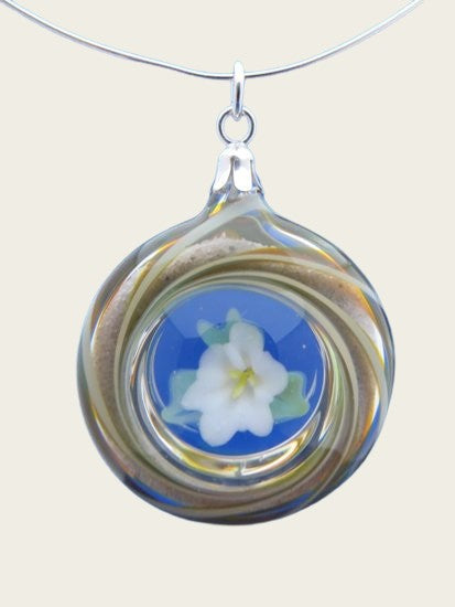 Each handmade Flower in glass memorial pendant is unique. This beautiful glass pendant can be filled with ashes, hair, sand etc. after which the glass is melted shut and then provided with a silver clasp to wear on a chain. This way you can carry a memory of your loved one with you.