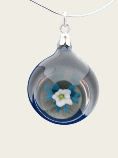 Each handmade Flower in glass memorial pendant is unique. This beautiful glass pendant can be filled with ashes, hair, sand etc. after which the glass is melted shut and then provided with a silver clasp to wear on a chain. This way you can carry a memory of your loved one with you.