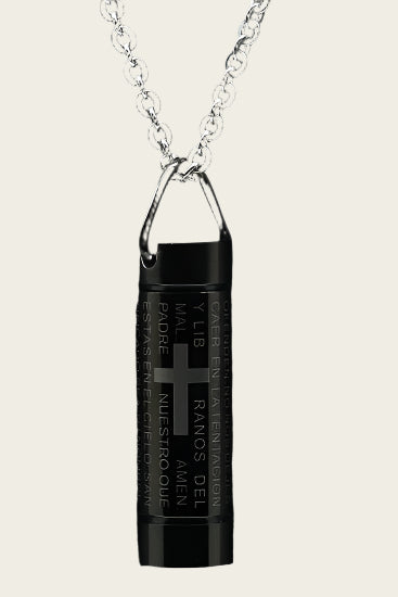 This beautifully finished stainless steel Ash & Remembrance Tube black with cross and prayer chain pendant is of good quality and comes in a free gift box.