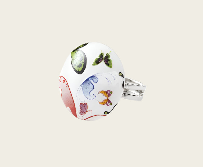 This beautiful ring is made of fine white porcelain and hand-made and painted in European studios, making each ring unique. This may cause the ring to differ slightly from the image in terms of motif.