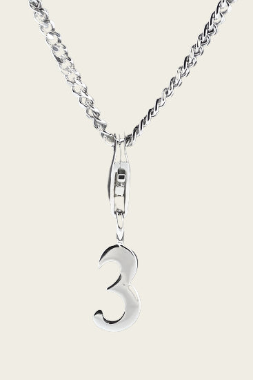 The price of the silver Number 3 pendant and charm does not include the chain shown.