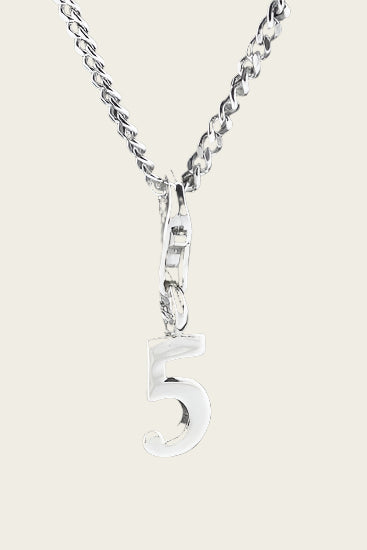 This beautifully finished silver Number 5 five pendant and charm comes in a free gift box.