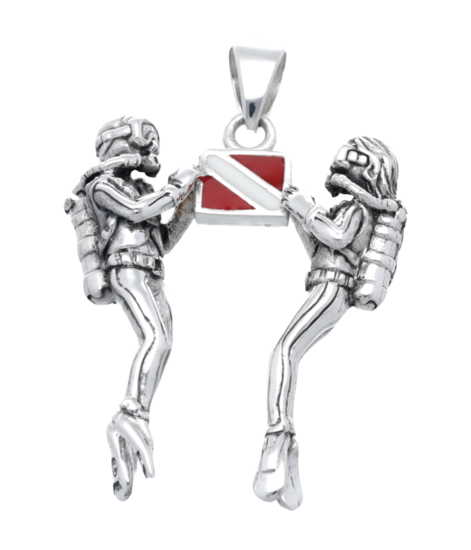 This beautifully finished Silver Divers with diving flag necklace pendant comes in a free gift box.