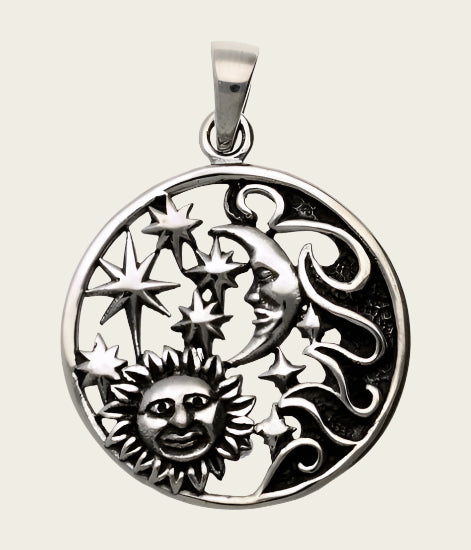 Silver Sun, Moon and Stars Round Necklace Pendant