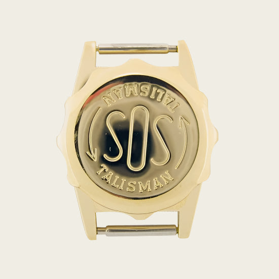 U kunt deze vergulde SOS Talisman horloge dragen in combinatie met uw eigen horloge óf u draagt deze in combinatie met een stevige zwart nylon horlogeband. Kijk hiervoor op "SOS Talisman Accessoires".