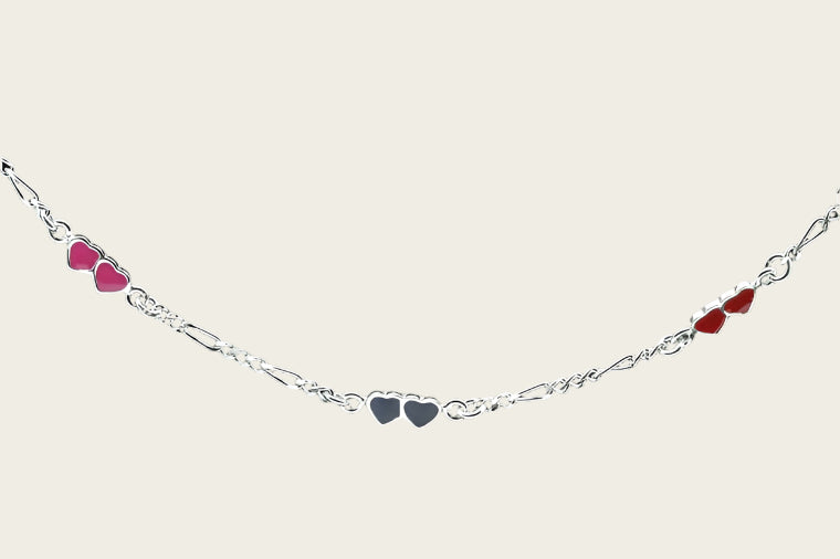 Deze fraai afgewerkte zilveren dubbelhart Kinder armband is geschikt voor kinderen van ca. 2 tot 6 jaar en is ca. 14 cm. lang.
