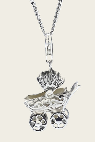De prijs van de zilveren Kinderwagen draaiende wielen hanger én bedel is exclusief de afgebeelde ketting.