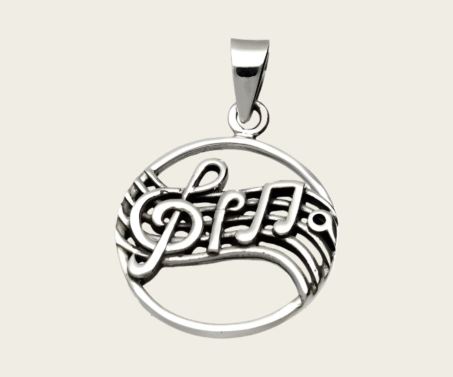 Zilveren Muziekbalk met muzieksleutel en muzieknoten rond ketting hanger