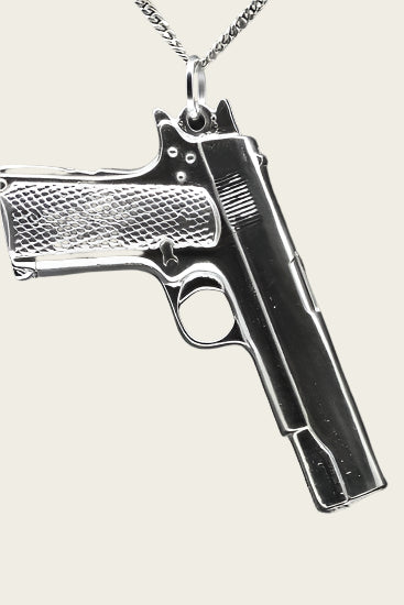 De prijs van de Zilveren Pistool XL grip rasp ketting hanger is excl. de afgebeelde ketting. Bijpassende kettingen vindt u onder de rubriek: Zilveren kettingen voor hangers.