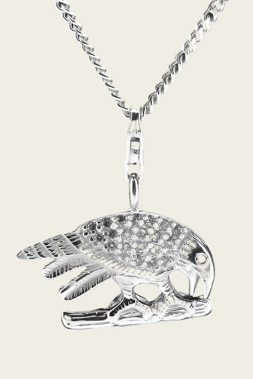 De prijs van de zilveren Raaf met witte kristallen hanger én bedel is exclusief de afgebeelde ketting.