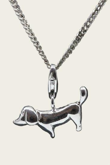 De prijs van de zilveren Teckel abstract hanger én bedel is exclusief de afgebeelde ketting.